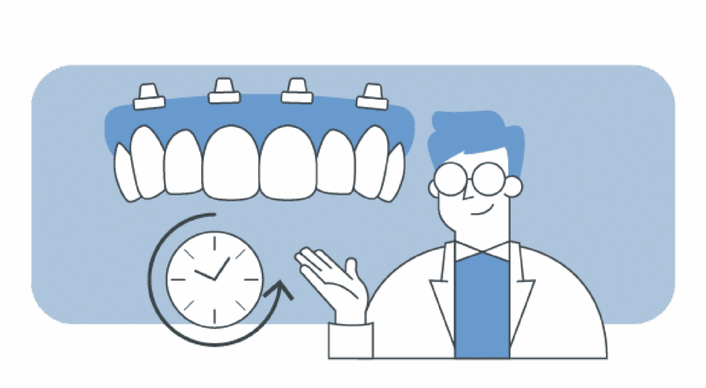 手術當天即可完成,早上手術,下午製作假牙,您當天就可以恢復原本有牙齒的燦爛笑容。(術後傷口復原中,建議先避免吃過硬的食物唷!)